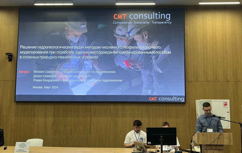 Along with the conference, an exhibition of hydrogeological equipment and software was organized on March 5, at which Roman Bondarenko (Head of the Department of Geomechanics and Hydrogeology of CMT Consulting), in the format of a poster presentation “Hydrogeological consulting in the mining industry: field work, audit, modeling, risk management,” presented to the audience in more detail one of the activities of our company.